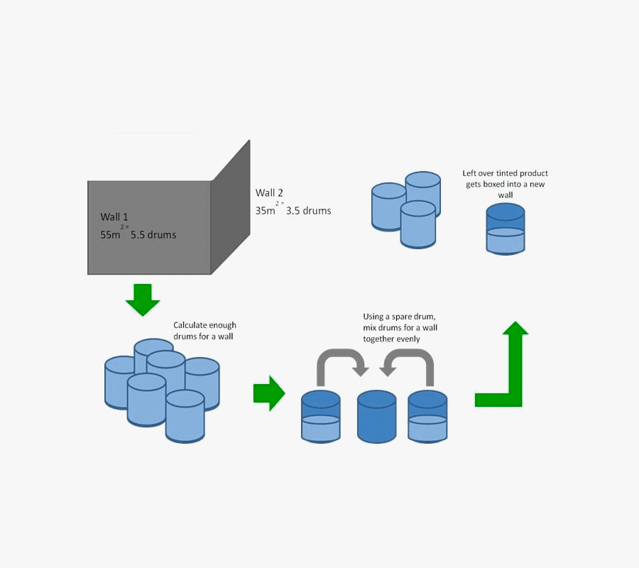 - Before completing the last wall check you have enough product to finish the job. If you are short, make sure you leave the old drums and box with the new drums purchased. Ratio needs to be 2 old: 1 new.